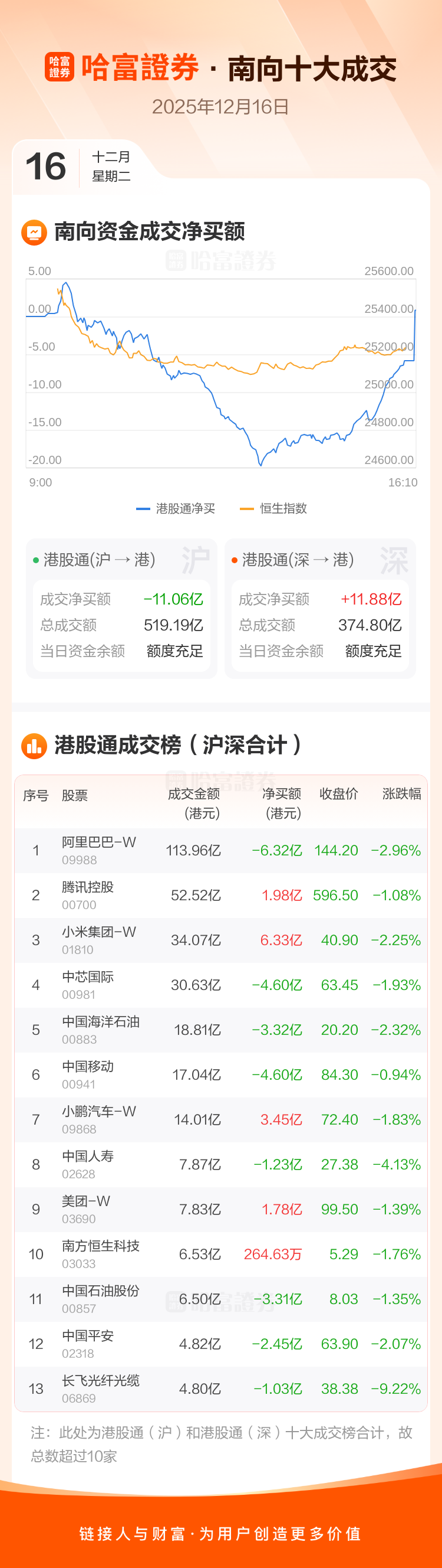 恒生指数12月16日跌1.54%,收报25235.41点。南向资金今日净买入港股8202.90万港元。南向资金今日成交额893.99亿港元,港股大市成交2015.28亿港元。