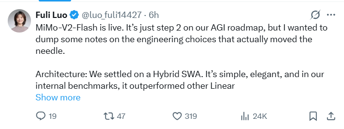 据了解,小米将AI视为核心战略方向,而罗福莉的加入加速了技术落地。此前,罗福莉在社交平台上曾明确表示:“MiMo-V2-Flash已经上线。这只是我们AGI路线图上的第二步。”