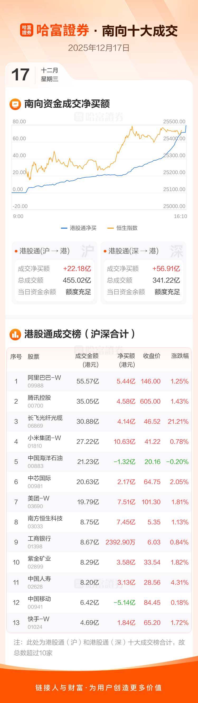 恒生指数12月17日涨0.92%,收报25468.78点。南向资金今日净买入港股79.09亿港元。南向资金今日成交额796.24亿港元,港股大市成交1831.41亿港元。