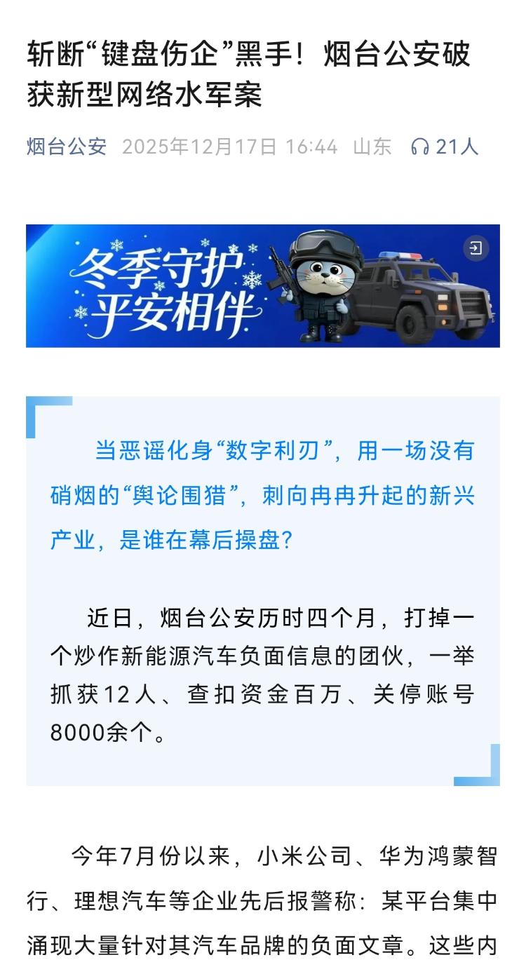 12月17日,烟台市公安局官微发布一起针对多家知名汽车企业的大规模、有组织“网络水军”犯罪案件。经深入侦查,烟台市公安局民警成功打掉一个利用人工智能技术批量制造负面信息、非法牟利的犯罪团伙,抓获犯罪嫌疑人12名,查扣涉案资金100余万元,关停违法账号8000余个。