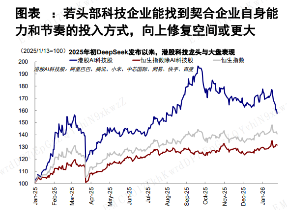 产业趋势决定结构强弱。作为港股特色的分红、科技、消费和周期四类板块,港股科技以互联网和 AI模型为主,硬件占比较小;消费特色主要在新消费上;强周期板块以龙头公司主导,权重小于A股; 分红板块较A股股息率更高,具有防御属性,因此支撑港股和估值弹性的主要是科技(尤其是AI)和新消费板块。近期关于新技术冲击旧技术商业模式、AI泡沫的讨论再度增多,我们判断AI的长期产业趋势依然存在,持续投入或是必然选择,只是结构会进一步走向分化,若港股头部科技企业能找到契合企业自身能力和发展节奏的投入方式,港股向上修复的空间和确定性或会更大。