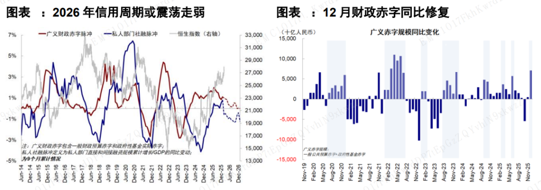 信用周期决定指数空间。受收入预期偏弱、回报与成本倒挂问题影响,私人部门传统需求仍有不足, 高基数下 2026 年私人社融脉冲或继续走弱,作为对冲的财政若仅是维持 2025 年的支持力度,广义财政赤字脉冲也大概率将继续走低。基准情形下,若政策仅发挥托底作用,2026 年仍将转向信用周期震荡放缓但产业趋势延续。往前看,两会对政策总量和方向的定调是关键。2026 年地方两会分省加权平均GDP增速目标从去年的 5.3%小幅下调至 5.1%2,后续政策效果需关注两个维度:一是看总量上是否大举发力,二是看结构上是否会向提振内需(如收入、社保)和缓释系统性风险(如化债、 收储)倾斜。若政策仅发挥托底作用,中国信用周期大概率震荡走弱,指数空间有限。如果财政大举发力,且进一步向内需与兜底居民资产负债表倾斜,基本面或加快修复,以支撑指数表现。