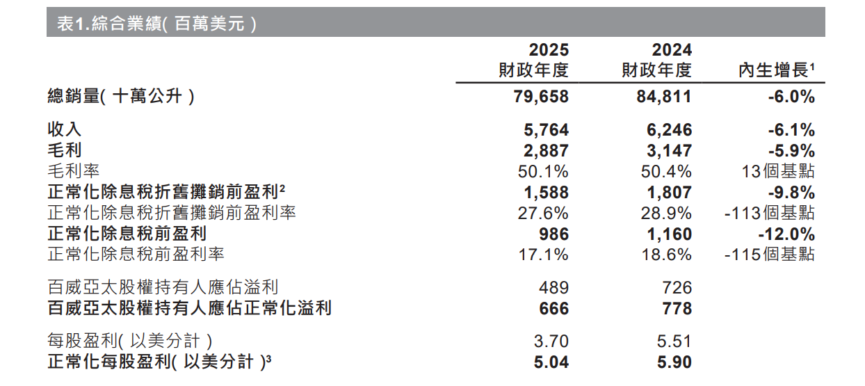 具体来看,在中国市场,2025年百威亚太销量及收入分别减少8.6%及11.3%;每百升收入减少3.0%。