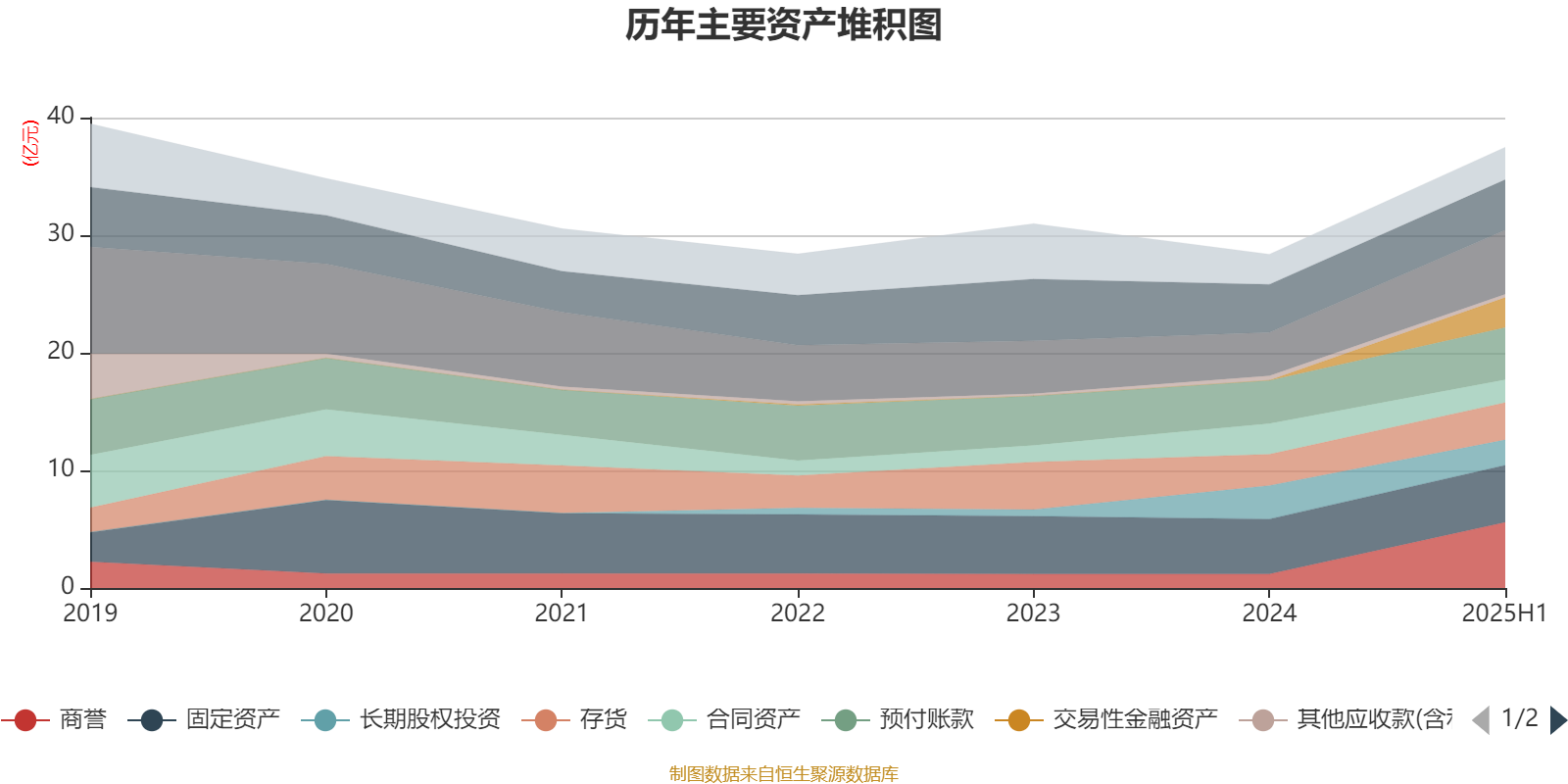资产重大变化方面,截至2025年上半年,公司商誉较上期末增加373.86%,占公司总资产比重上升10.74个百分点;交易性金融资产较上期末增加15560.96%,占公司总资产比重上升6.75个百分点;长期股权投资较上期末减少24.34%,占公司总资产比重下降4.29个百分点;合同资产较上期末减少25.44%,占公司总资产比重下降4个百分点。