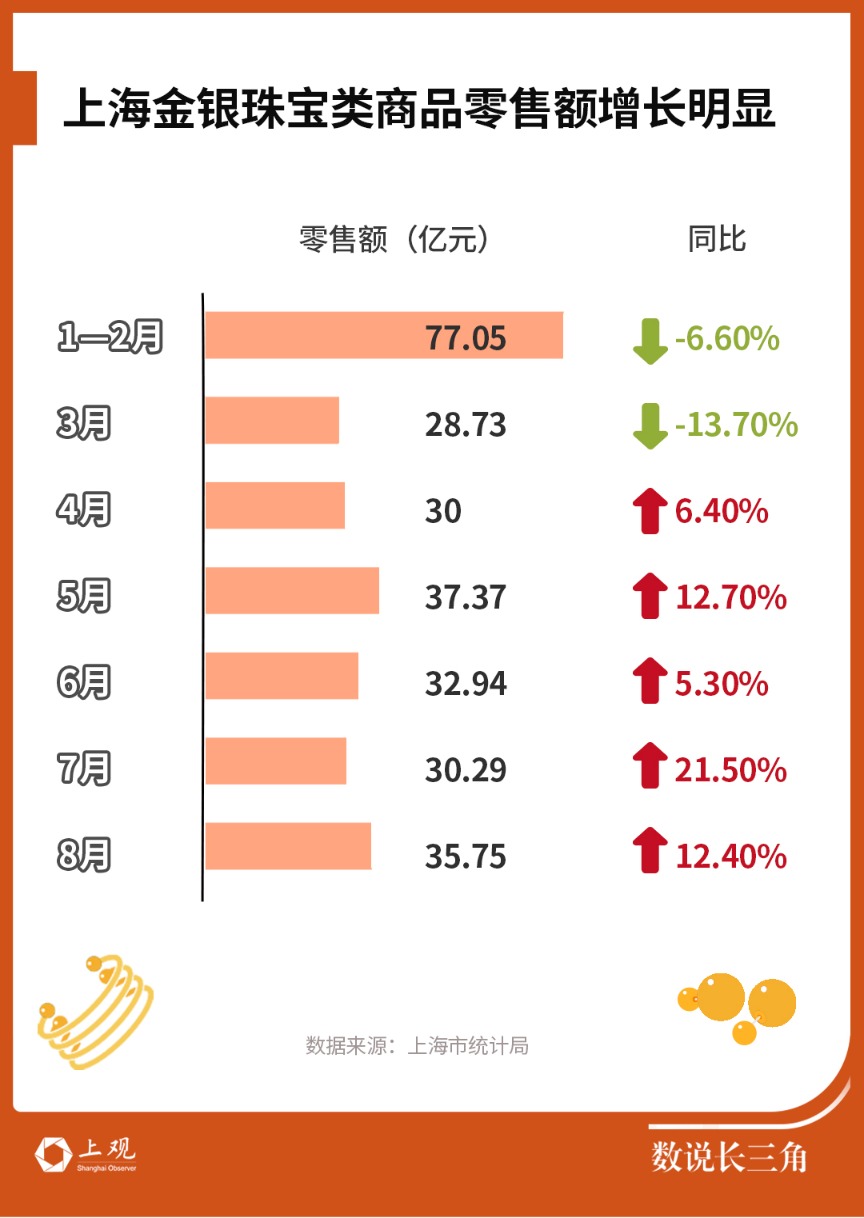 回顾今年到目前公布的金银珠宝类社零情况,尽管受整体社零影响,年初的一二三月金银珠宝类商品零售额同比有所下降。但从四月开始,则一直保持升势,7月甚至达到了21.5%的高增长。值得说明的是,上海的金银珠宝类商品零售额增速普遍在整体社零增速以上,例如,4月上海整体社零增长2.6%,而金银珠宝类增长6.4%;5月整体社零增长7.5%,金银珠宝类增长12.7%。