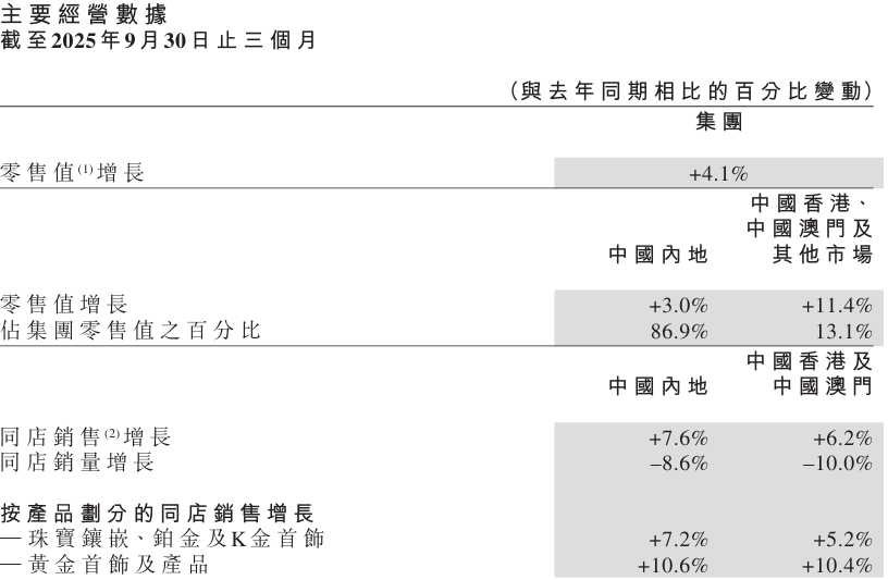 周大福第三季度零售值同比增长4.1% 内地市场表现突出