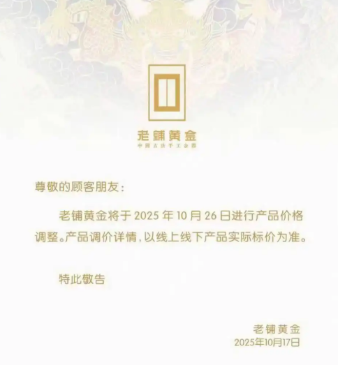 受到金价一路上涨的影响,近期不少品牌金饰企业再度上调了产品价格。比如老铺黄金今日宣布,将于10月26日再度调整产品的价格。这已经是公司年内第三次涨价。