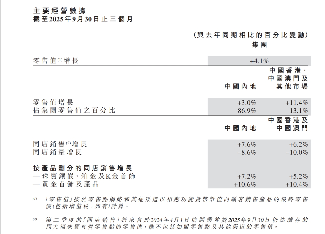 10月17日盘后,周大福集团发布第二季度(截至2025年9月30日止三个月) 未经审核主要经营数据。报告期内,集团零售值增长4.1%。其中,定价黄金产品类别的零售值增长增速同比增长43.7%。