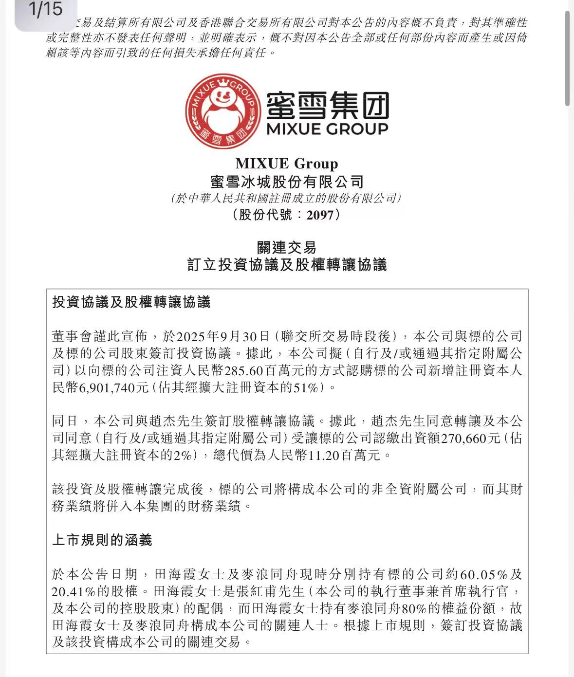 近日,蜜雪集团于香港联交所发布公告,公司已与福鹿家(郑州)企业管理有限公司(以下简称“鲜啤福鹿家”或“福鹿家”)及其股东签订投资协议。蜜雪集团拟向鲜啤福鹿家注资 2.86亿元,占其经扩大注册资本的51%;同日,蜜雪集团与独立第三方股东签订股权转让协议,受让其持有的鲜啤福鹿家经扩大注册资本的2%股权。