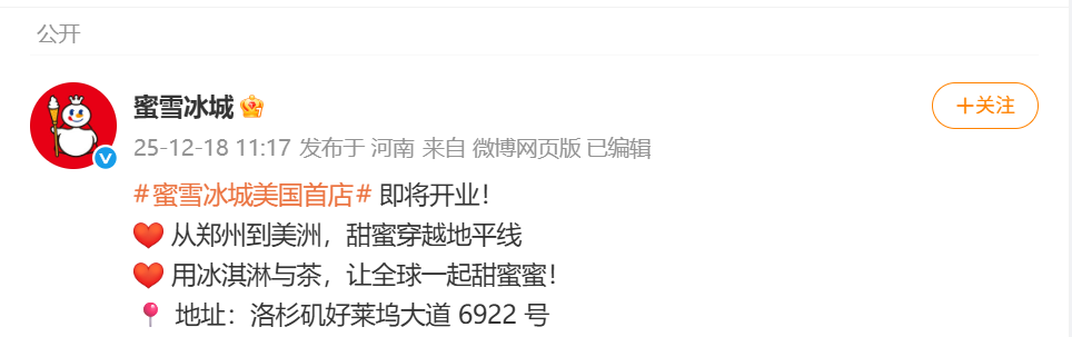 12月18日,@蜜雪冰城宣布,蜜雪冰城美国首店即将开业。