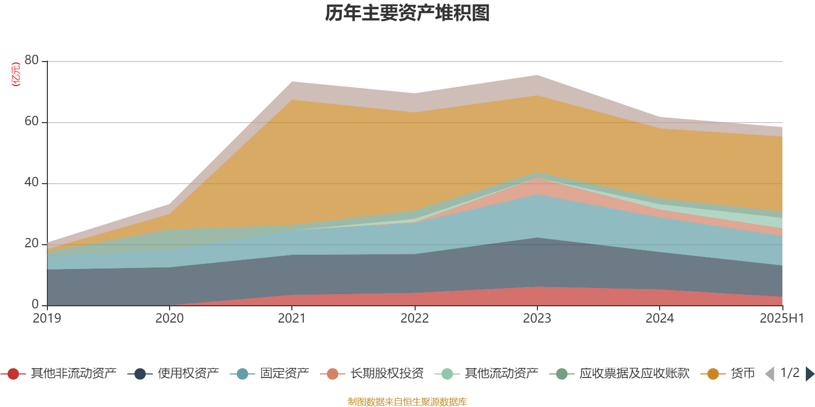 资产重大变化方面,截至2025年上半年,公司货币资金较上期末增加7.64%,占公司总资产比重上升5.1个百分点;其他非流动资产较上期末减少46.41%,占公司总资产比重下降3.62个百分点;其他流动资产较上期末增加100%,占公司总资产比重上升3.07个百分点;使用权资产较上期末减少16.08%,占公司总资产比重下降2.25个百分点。