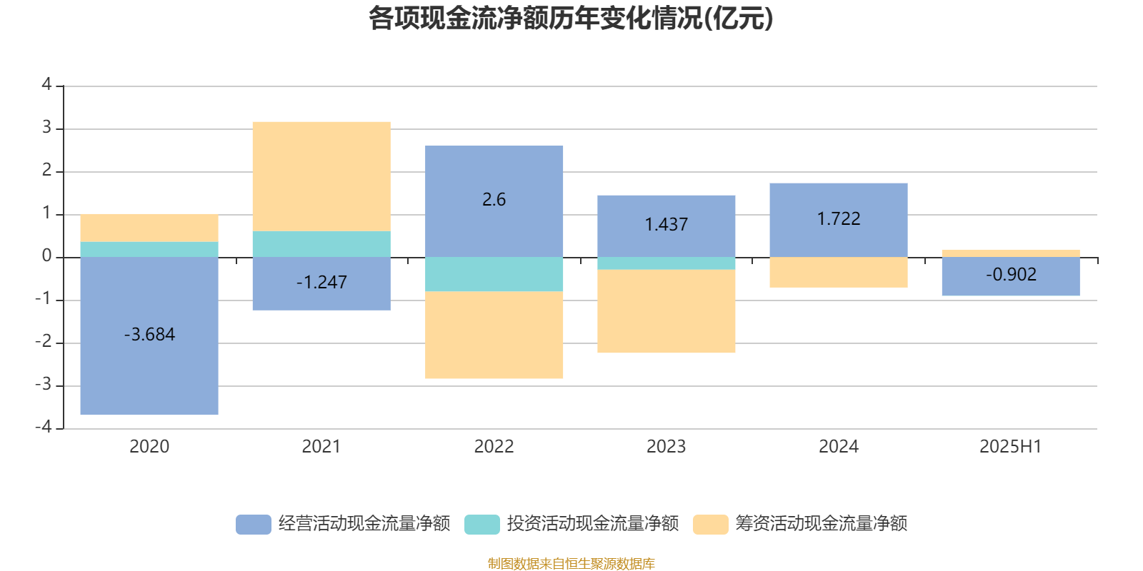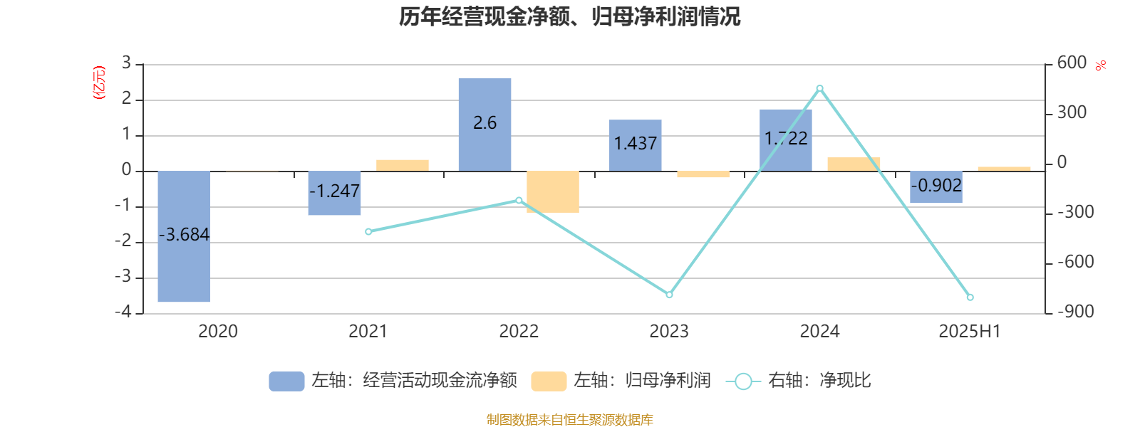 2025年上半年,公司经营活动现金流净额为-9017.7万元;筹资活动现金流净额1670.9万元;投资活动现金流净额-57万元。