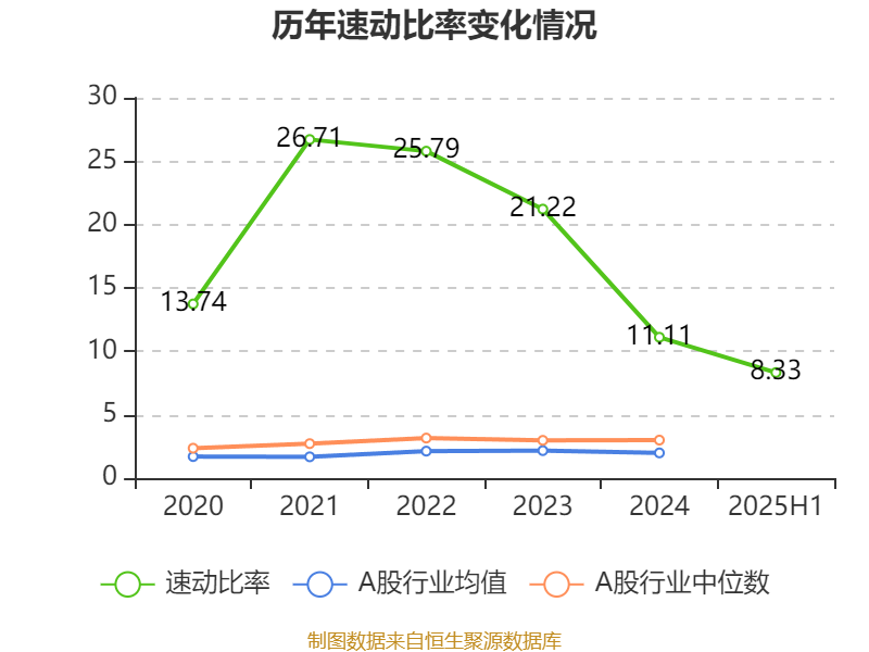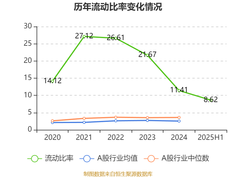 2025年上半年,公司流动比率为8.62,速动比率为8.33。