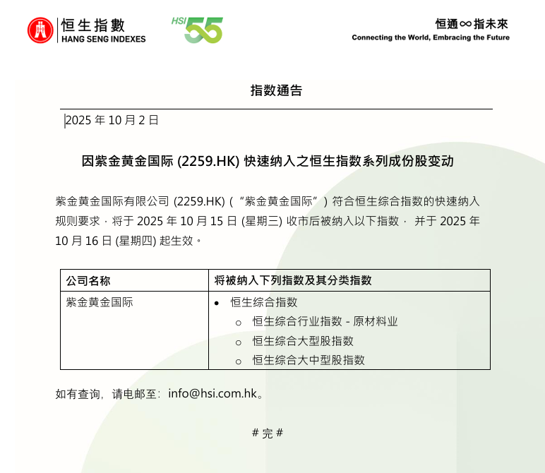 恒生指数公司:紫金黄金国际有限公司将于2025年10月15日(星期三)收市后被纳入恒生综合指数