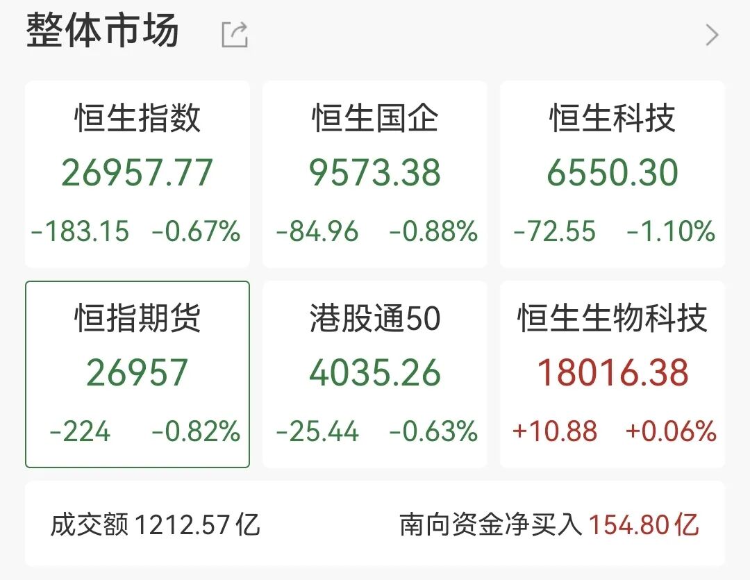 10月6日午后,港股持续调整,截至收盘,三大指数飘绿。恒生指数跌0.67%失守27000点,恒生科技指数跌1.1%,恒生中国企业指数跌0.88%。