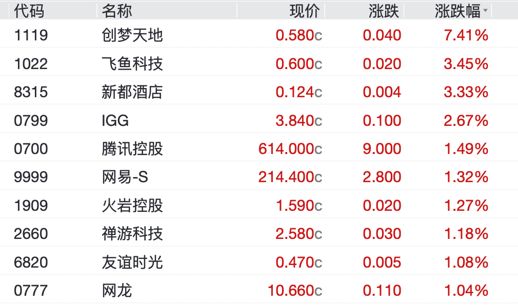 游戏股也出现普涨。其中,创梦天地上涨7.41%,飞鱼科技上涨3.45%,火岩控股、网龙等涨幅均超1%。