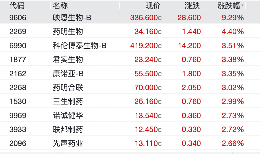 板块方面,当日创新药概念股涨幅靠前,其中,映恩生物涨幅达9.29%,药明生物涨幅达4.4%。