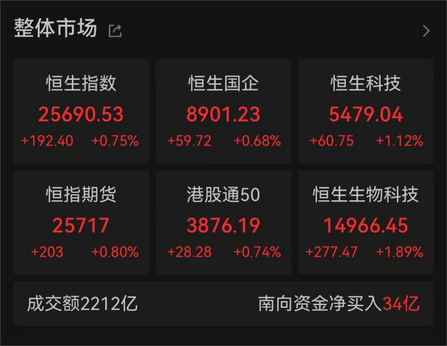 12月19日,港股三大指数高开高走,截至收盘,恒生指数上涨0.75%,恒生科技指数上涨1.12%,恒生国企指数上涨0.68%。