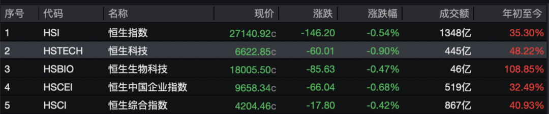 10月3日,港股三大指数集体下跌。恒生指数盘中一度跌破27000点,14时后拉升,收跌0.54%,报27140.92点,恒生科技指数收跌0.90%,恒生国企指数收跌0.68%。全日大市成交额为1348亿港元。