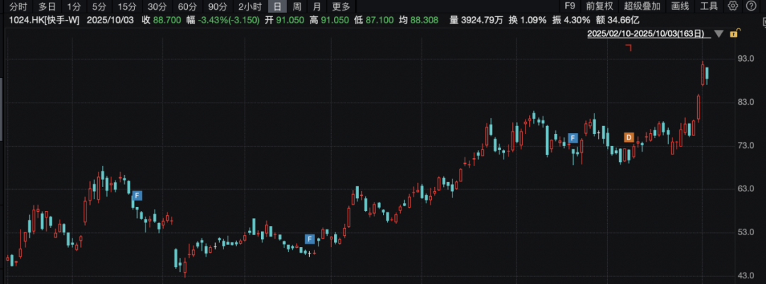10月3日,快手-W收跌3.43%,回吐部分前日涨幅。10月2日,快手-W涨8.57%,跑赢恒指。
