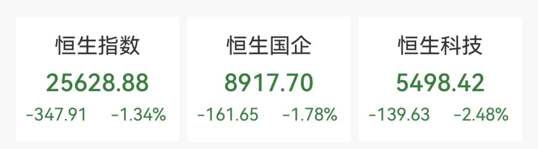 12月15日,港股低开低走,全日单边下行,三大指数集体收跌。截至收盘,恒生指数收跌1.34%,报25628.88点;恒生中国企业指数收跌1.78%,报8917.70点;恒生科技指数收跌2.48%,报5498.42点。