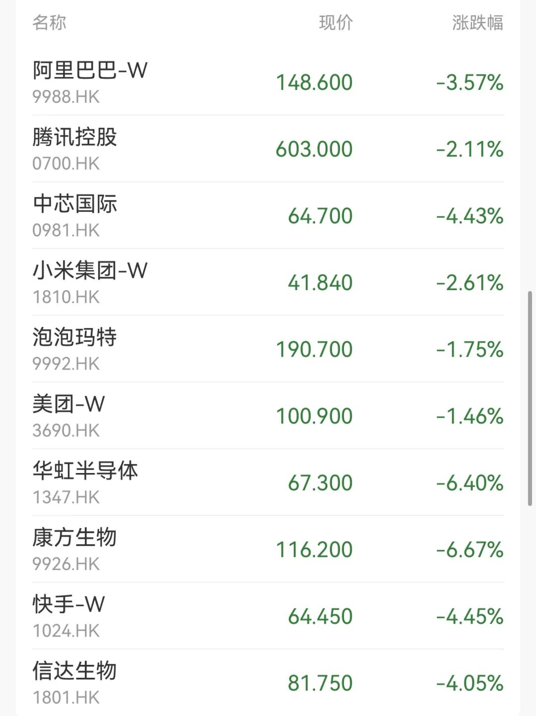 盘面上,大型科技股集体下挫,百度集团-SW跌超5%,快手-W跌超4%,商汤-W、阿里巴巴-W跌超3%,小米集团-W、腾讯控股跌超2%;半导体股多数下跌,英诺赛科跌超9%,华虹半导体跌超6%,中芯国际跌超4%;生物技术股走弱,百济神州跌超8%,康方生物跌超6%,药明生物跌超3%。此外,机器人概念股、汽车股、苹果概念股纷纷走低。