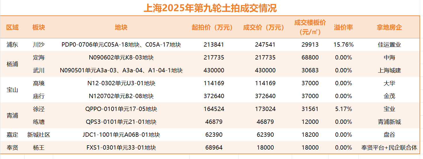 至此,上海第九批次土拍推出的9宗地块全部成功出让,总出让建面55.26万平方米(其中商办用地约2.03万平方米),总土地出让金额173.33亿元,成交楼面均价31366元/平方米。
