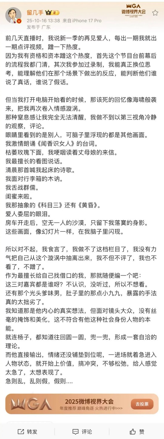 新一季《再见爱人》开播后,留几手发文表示不会更新《再见爱人5》的点评视频,坦言再回忆节目会有窒息感。此外他还调侃新一季嘉宾(路行)的表现“过于急切”“不够松弛”,认为其有刻意表达制造冲突之嫌。