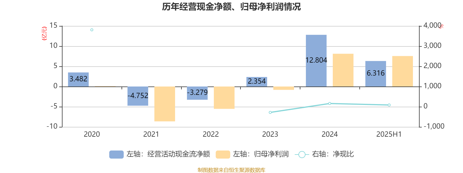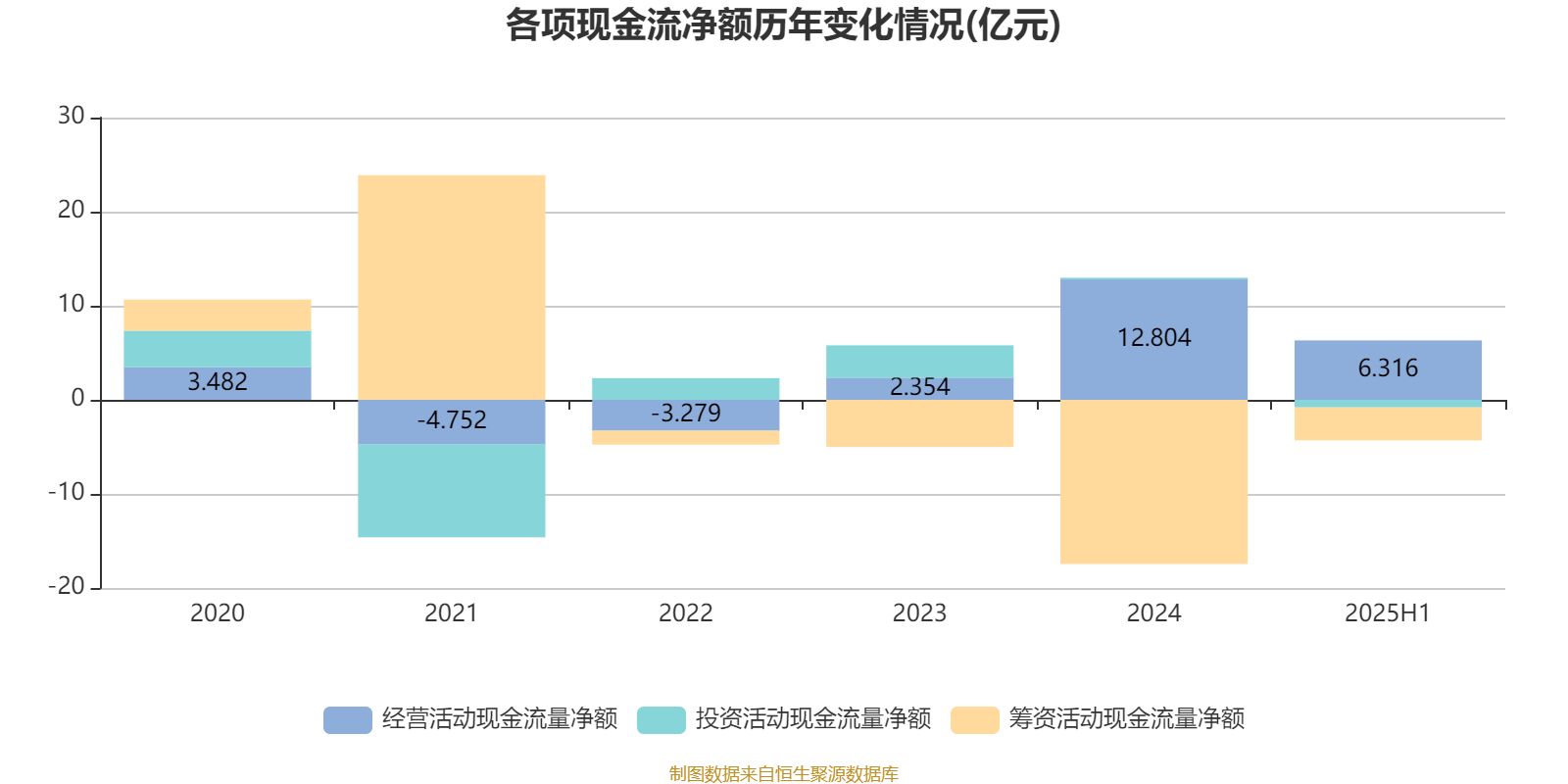 2025年上半年,公司经营活动现金流净额为6.32亿元;筹资活动现金流净额-3.5亿元;投资活动现金流净额-8036.4万元。