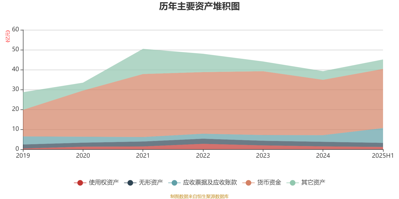 资产重大变化方面,截至2025年上半年,公司应收票据及应收账款较上期末增加123.01%,占公司总资产比重上升7.99个百分点;货币资金较上期末增加6.85%,占公司总资产比重下降5.01个百分点;无形资产较上期末减少11.39%,占公司总资产比重下降1.33个百分点;使用权资产较上期末减少19.38%,占公司总资产比重下降1.1个百分点。