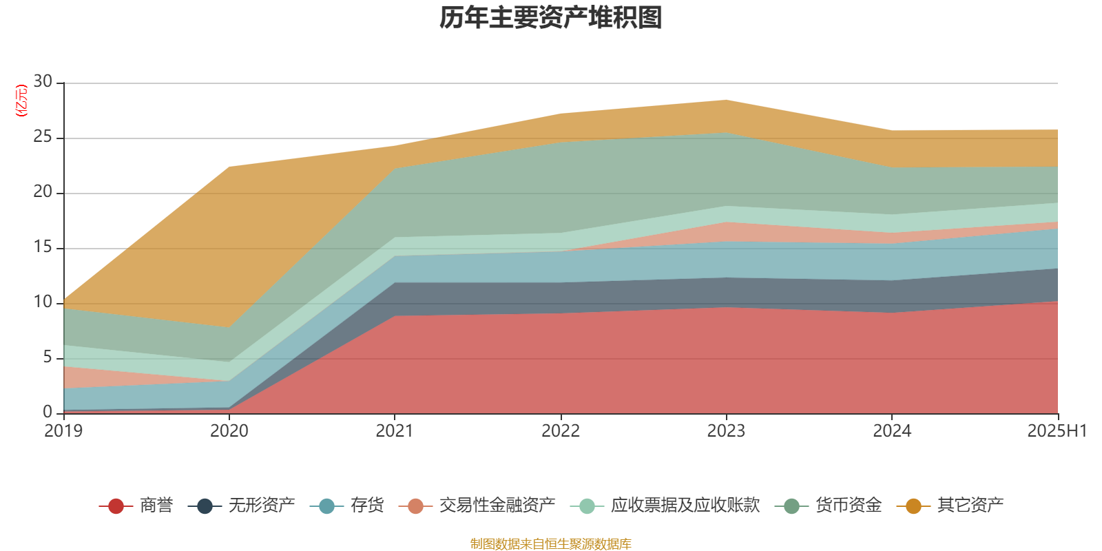 资产重大变化方面,截至2025年上半年,公司商誉较上期末增加11.65%,占公司总资产比重上升4.03个百分点;货币资金较上期末减少22.89%,占公司总资产比重下降3.84个百分点;交易性金融资产较上期末减少36.56%,占公司总资产比重下降1.4个百分点;存货较上期末增加8.09%,占公司总资产比重上升1.02个百分点。