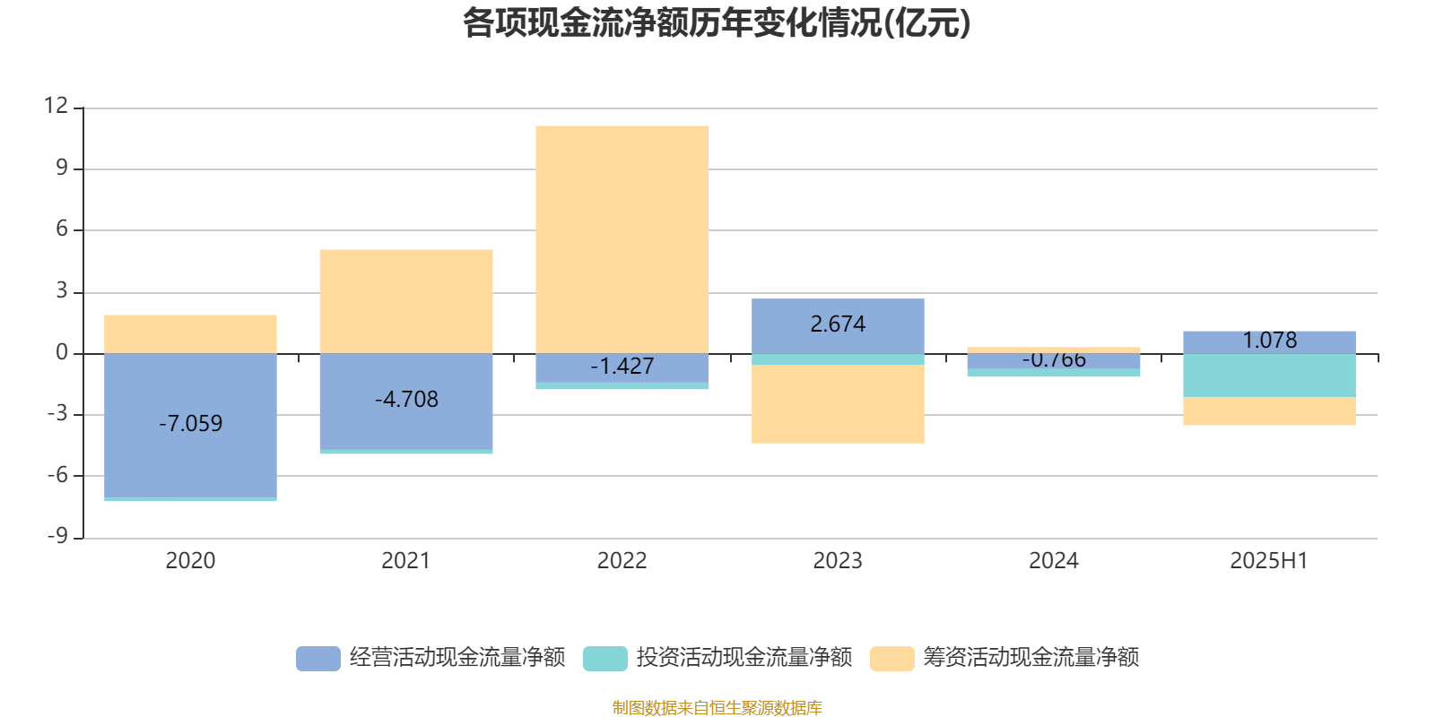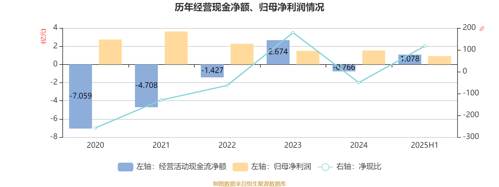 2025年上半年,公司经营活动现金流净额为1.08亿元;筹资活动现金流净额-1.35亿元;投资活动现金流净额-2.15亿元。