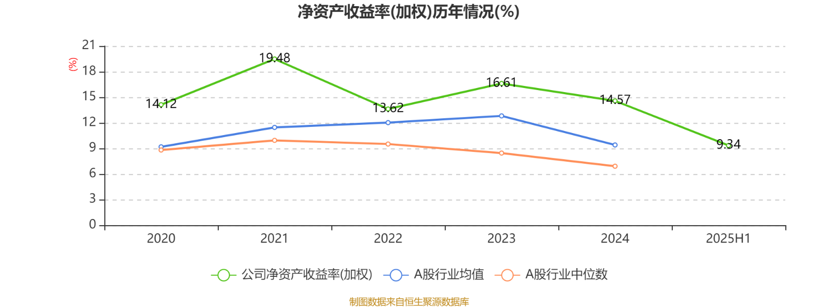 2025年上半年,公司平均净资产收益率为9.34%,较上年同期下降0.93个百分点。