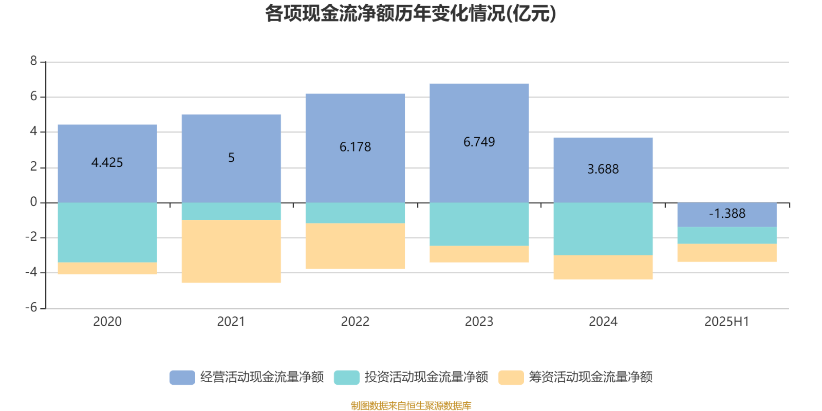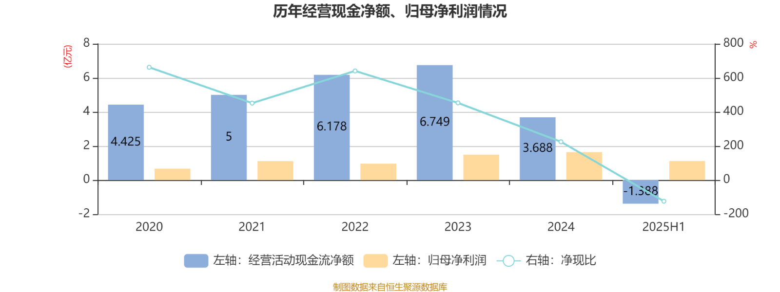 2025年上半年,公司经营活动现金流净额为-1.39亿元;筹资活动现金流净额-1.02亿元;投资活动现金流净额-9565.1万元。