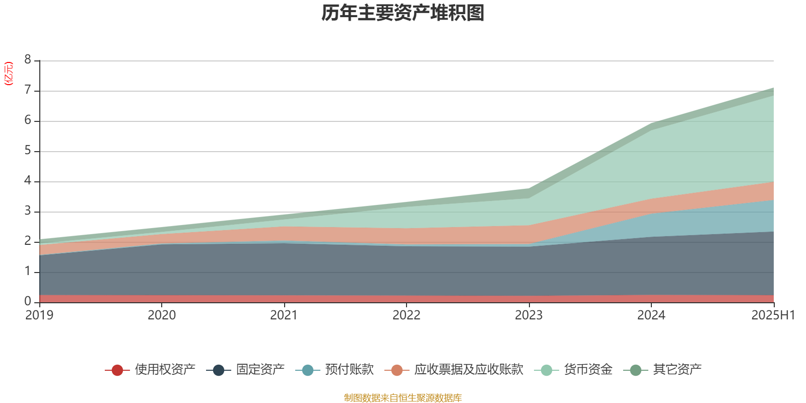 资产重大变化方面,截至2025年上半年,公司固定资产较上期末增加9.36%,占公司总资产比重下降2.82个百分点;货币资金较上期末增加26.06%,占公司总资产比重上升2个百分点;预付账款较上期末增加35.96%,占公司总资产比重上升1.75个百分点;使用权资产较上期末减少2.29%,占公司总资产比重下降0.75个百分点。