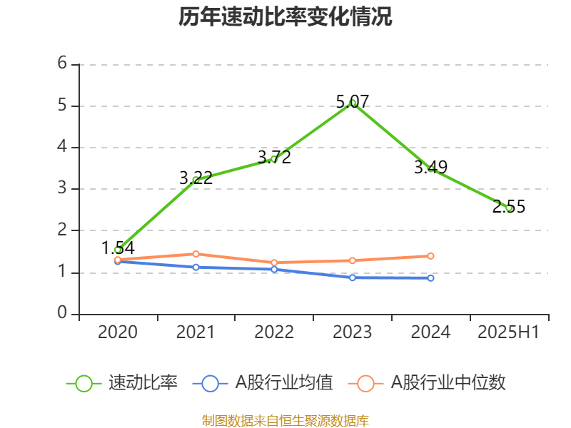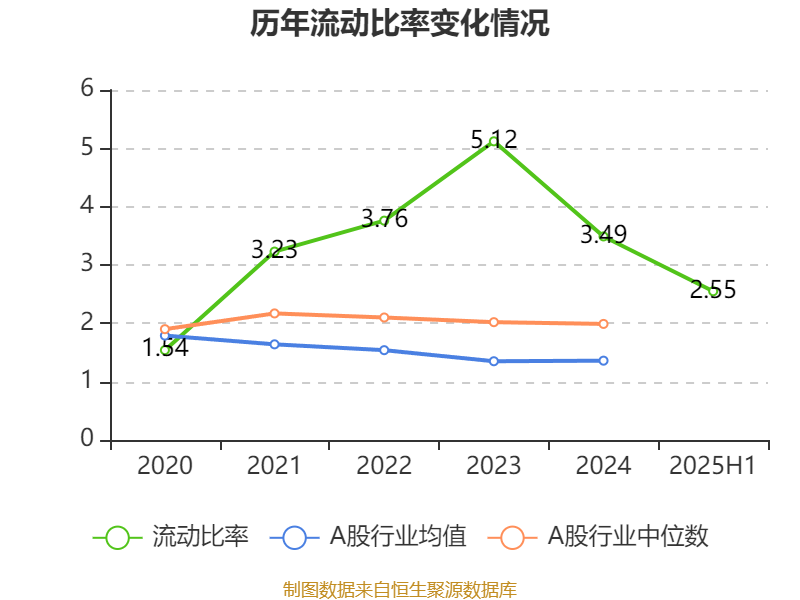 2025年上半年,公司流动比率为2.55,速动比率为2.55。