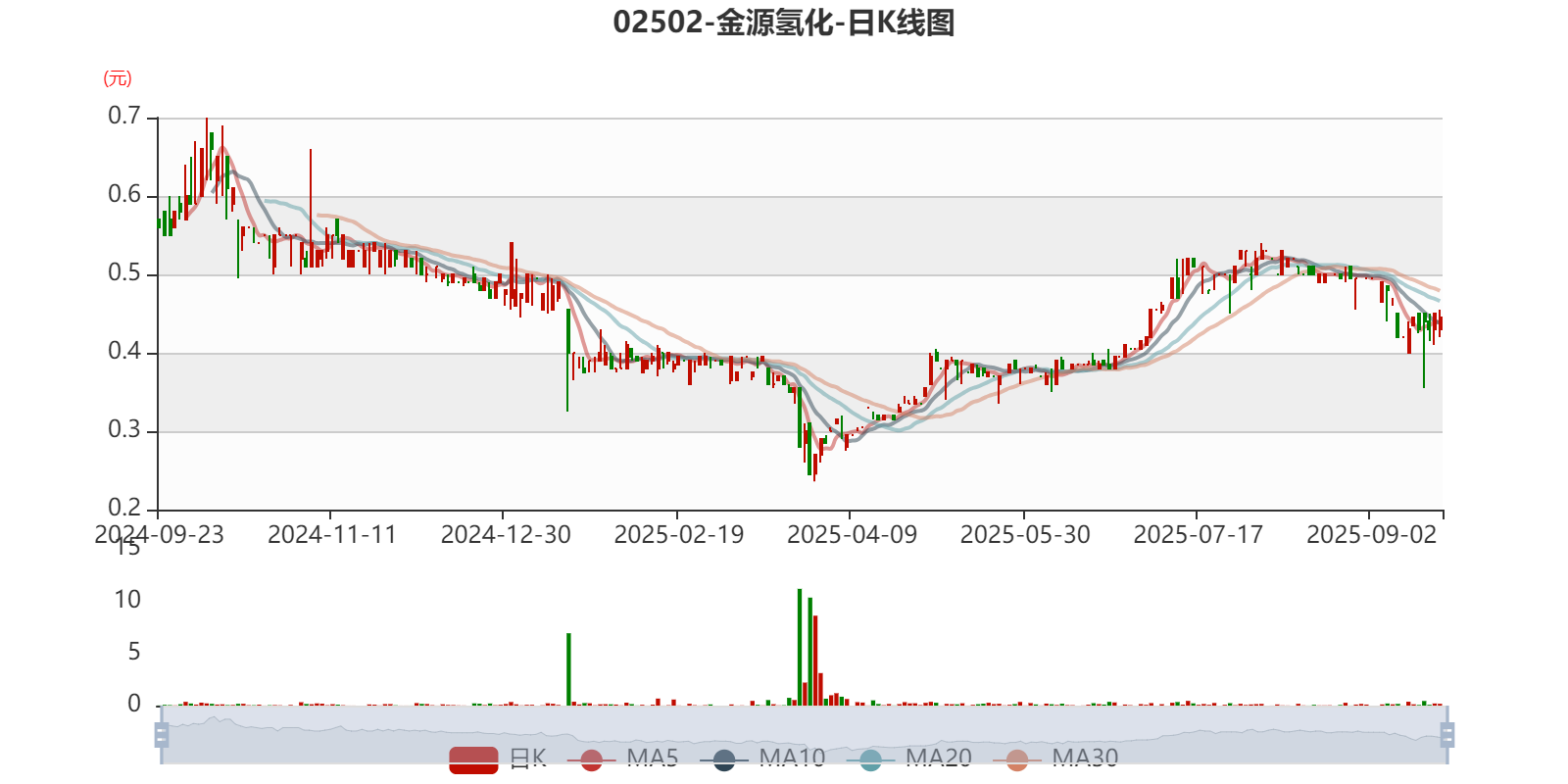 以9月21日收盘价计算,金源氢化目前市净率(TTM)约0.4倍,市销率(TTM)约0.13倍。