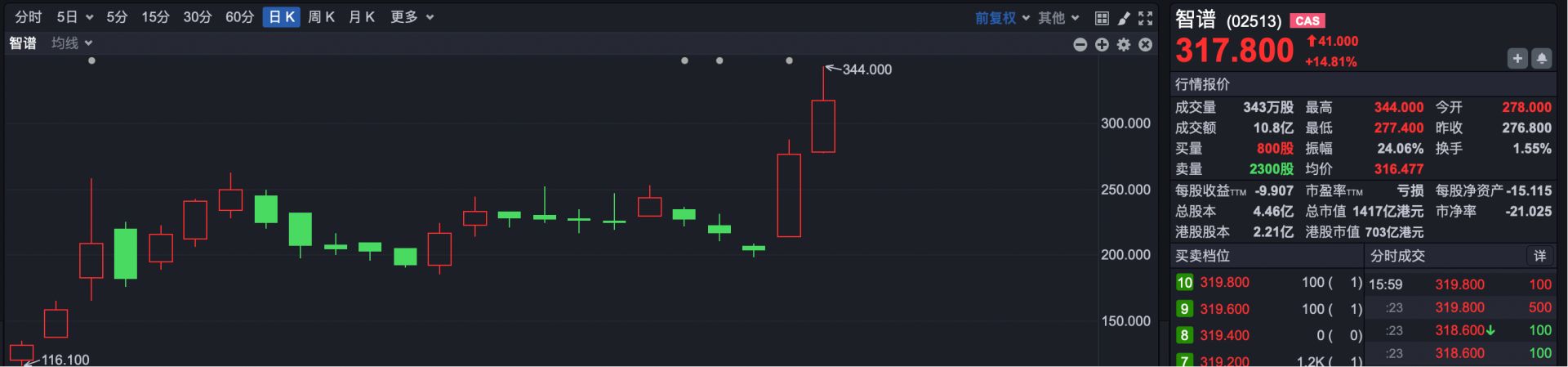 市场热点方面,AI应用股大涨,智谱(HK02513)涨超14%,创上市以来新高。