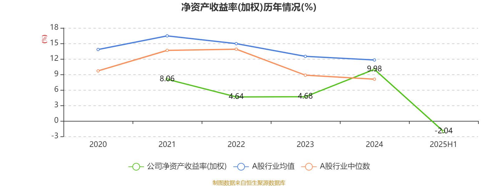 2025年上半年,公司平均净资产收益率为-2.04%,较上年同期下降7.7个百分点。
