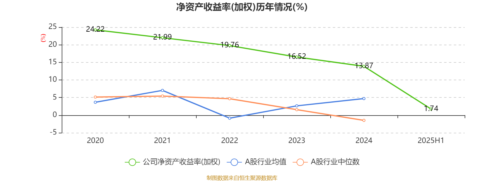 2025年上半年,公司平均净资产收益率为1.74%,较上年同期下降3.96个百分点。