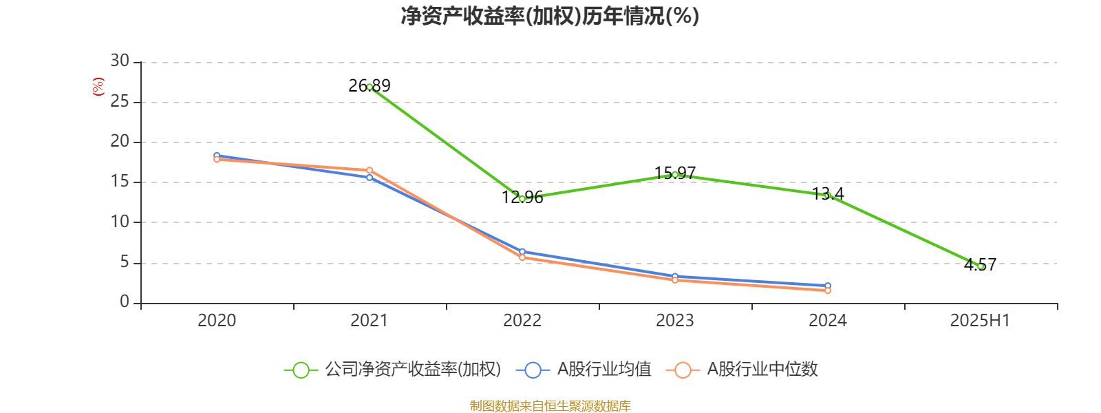 2025年上半年,公司平均净资产收益率为4.57%,较上年同期下降1.32个百分点。