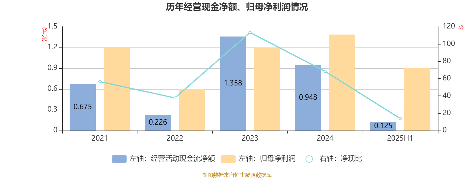 2025年上半年,公司经营活动现金流净额为1251.8万元;筹资活动现金流净额1218.6万元;投资活动现金流净额-3.46亿元。