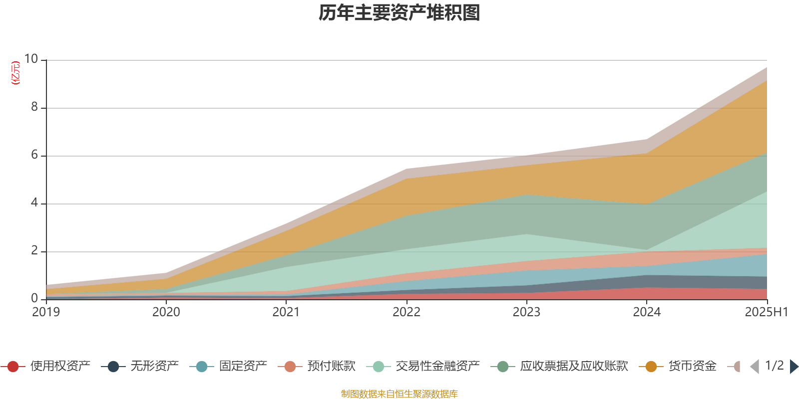 资产重大变化方面,截至2025年上半年,公司交易性金融资产较上期末增加3241.23%,占公司总资产比重上升23.18个百分点;应收票据及应收账款较上期末减少14.76%,占公司总资产比重下降11.81个百分点;预付账款较上期末减少55.74%,占公司总资产比重下降6.2个百分点;固定资产较上期末增加147.67%,占公司总资产比重上升4.01个百分点。