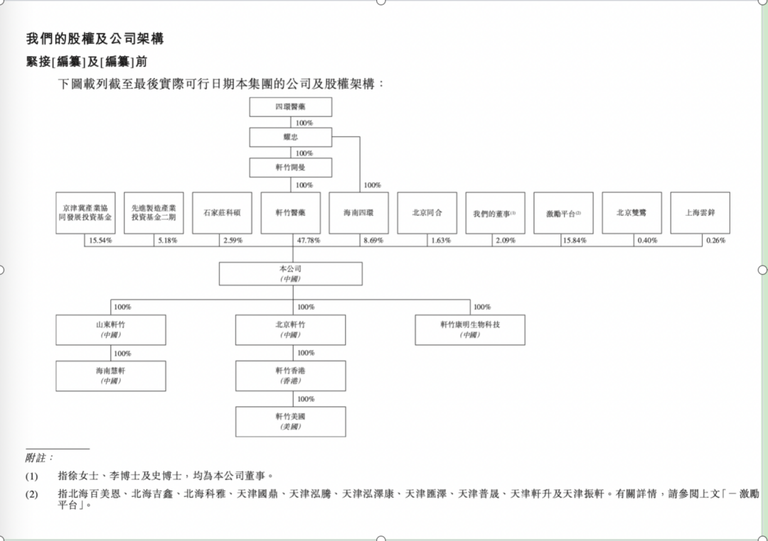 从股东结构来看,轩竹生物的控股股东包括四环医药控股集团及其关联方。截至最后实际可行日期,四环医药透过其间接全资附属公司轩竹医药及海南四环在轩竹生物全部已发行股本中拥有约56.47%的权益。公开资料显示,四环医药自2001年成立,并于2010年在港股上市,为国际化医美及生物制药企业。