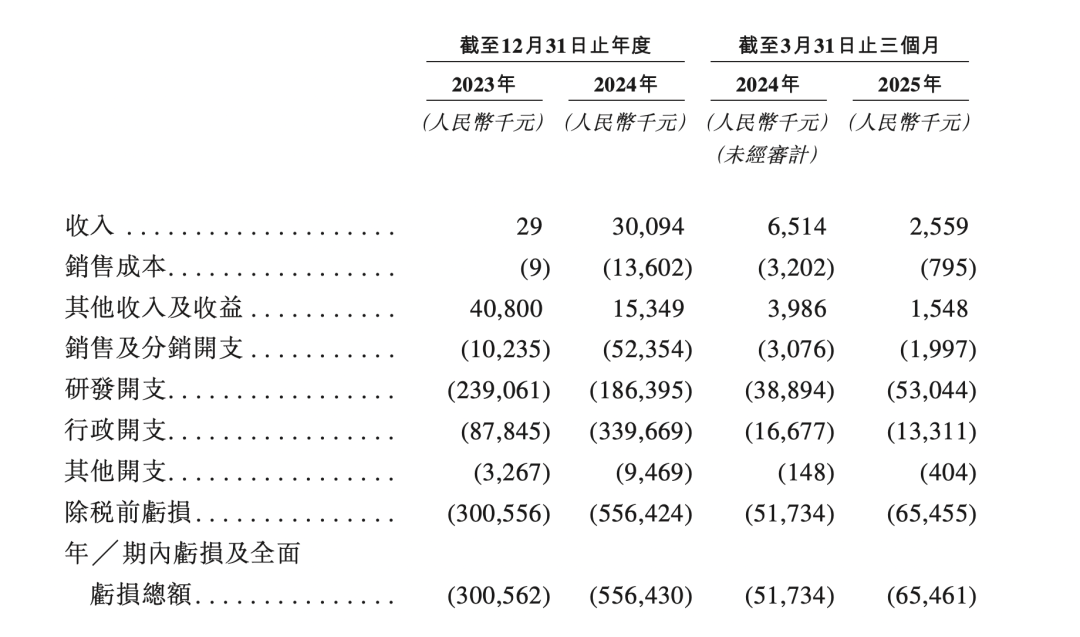 2023年至2025年3月,轩竹生物分别实现营业收入2.9万元、3009.4万元、255.9万元;亏损额分别为3.01亿元、5.56亿元和0.65亿元。