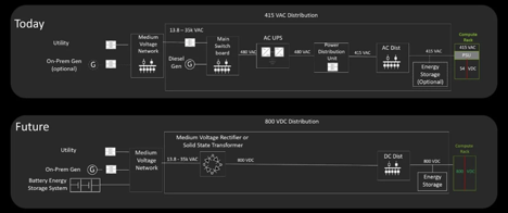 英伟达从 415 伏交流(上)到 800 伏直流(下)的配电架构演进
