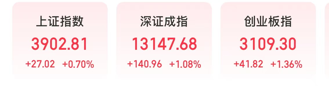 今天,A股上涨。截至收盘,上证指数上涨0.7%,深证成指上涨1.08%,创业板指上涨1.36%。