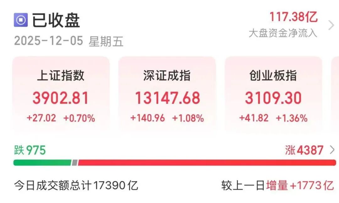 截至收盘,上证指数涨0.7%,深证成指涨1.08%,创业板指涨1.36%;全市场超4300只个股上涨。全市场成交额17390亿元,比上一交易日增加1773亿元。本周,上证指数涨0.37%,深证成指涨1.26%,创业板指涨1.86%。