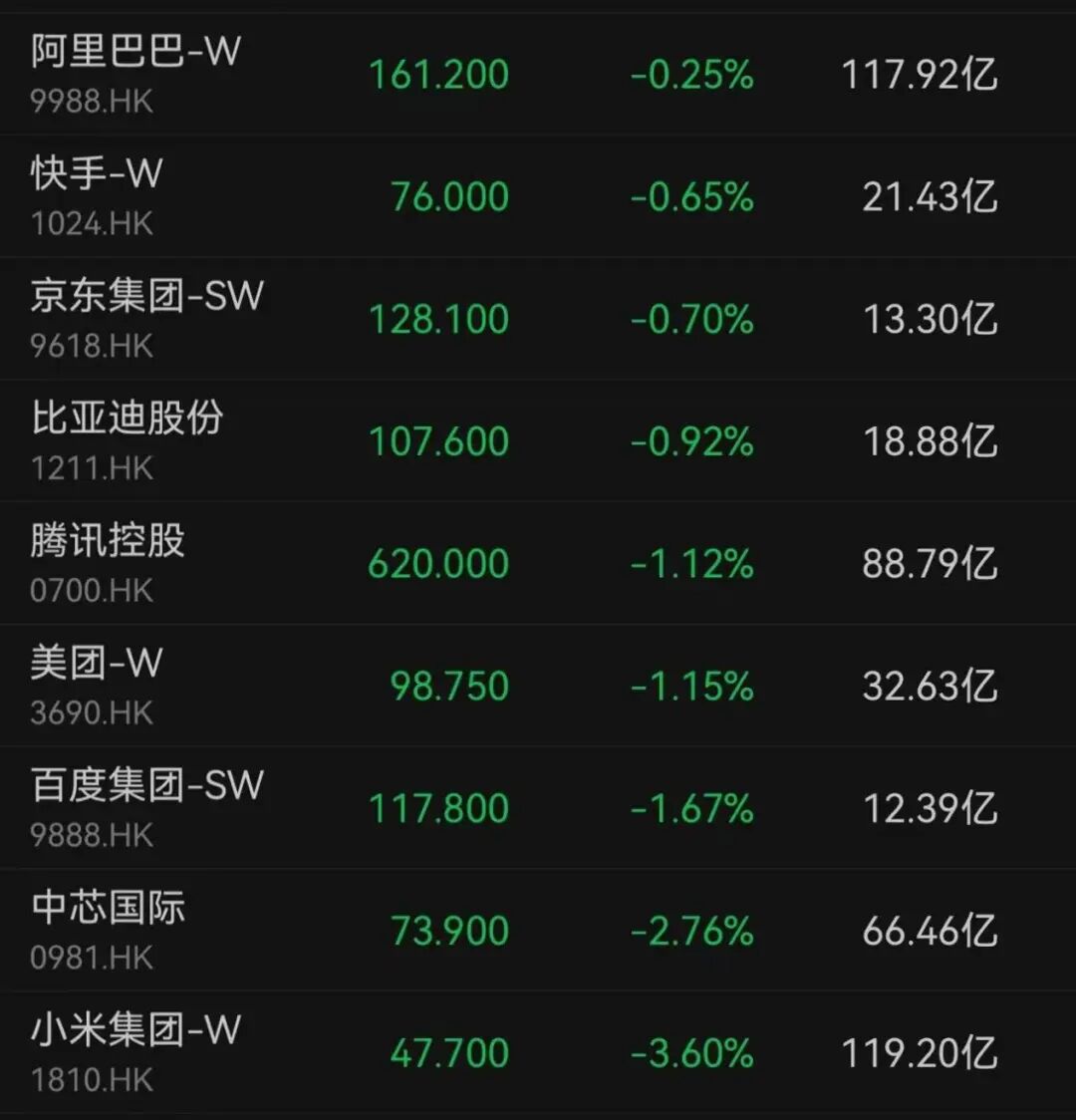科技“巨头”表现不佳,拖累恒生科技指数。小米跌超3%,中芯国际下跌2.76%,阿里巴巴、京东、美团等均下跌。