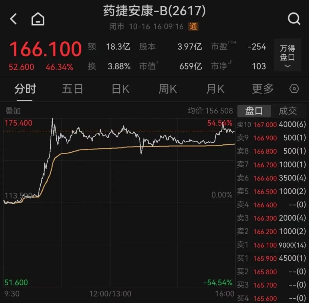 9月16日至10月16日,药捷安康股价处于阴跌状态。最新收盘价为166港元/股,尚未回到9月16日的收盘价192港元/股。
